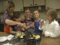 Am 26.06.2012 haben wir, die Klasse 4a, fast den ganzen Morgen mit den Landfrauen gekocht. Zuerst lernten wir etwas über die Kartoffel, z.B. dass die Kartoffel früher nur wegen ihrer Blüten gepflanzt wurde, oder dass Friederich, der Große, die Kartoffel nach Europa brachte. Dann ging´s an die Arbeit: Wir haben einen Wettbewerb gemacht und zwar ,,wer die längste Kartoffelschale beim Schälen erhält“. Die Landfrauen haben uns Kartoffelgerichte gezeigt und wir haben diese Gerichte mit ihnen zubereitet. Es war so lecker, denn es gab Kartoffelsuppe mit Möhren, Kartoffelpuffer , Kartoffelpüree und Apfelmus. Am Ende bekamen wir noch ein kleines Kochheft und ein großes Poster von einerMolkerei.