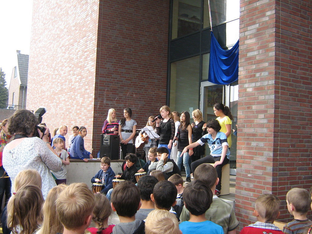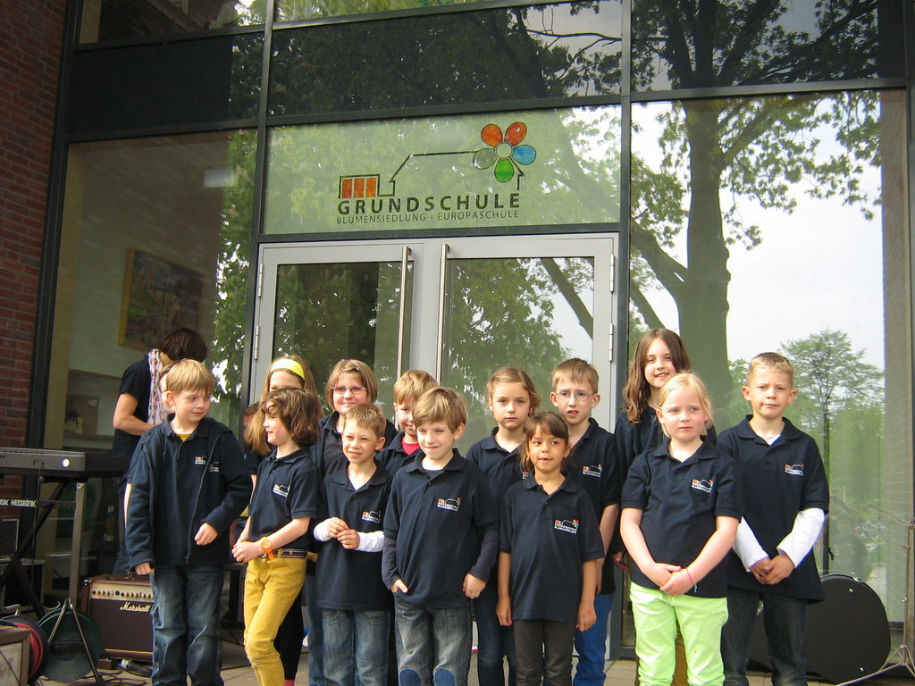 Nachdem der Anbau fertig gestellt und der Schulhof nach Wünschen und Vorstellungen der Kinder neu gestaltet worden ist hat die Grundschule Blumensiedlung sozusagen als „i-Tüpfelchen“ jetzt auch ein neues Schul-Logo erhalten. Am Mittwoch wurde es während des Frühlingssingens auf dem Schulhof feierlich enthüllt.Mit einem fetzigen Popsong begrüßte eine Schülerband der Klasse 4b ihre Mitschüler sowie Lehrer, Eltern und Großeltern.