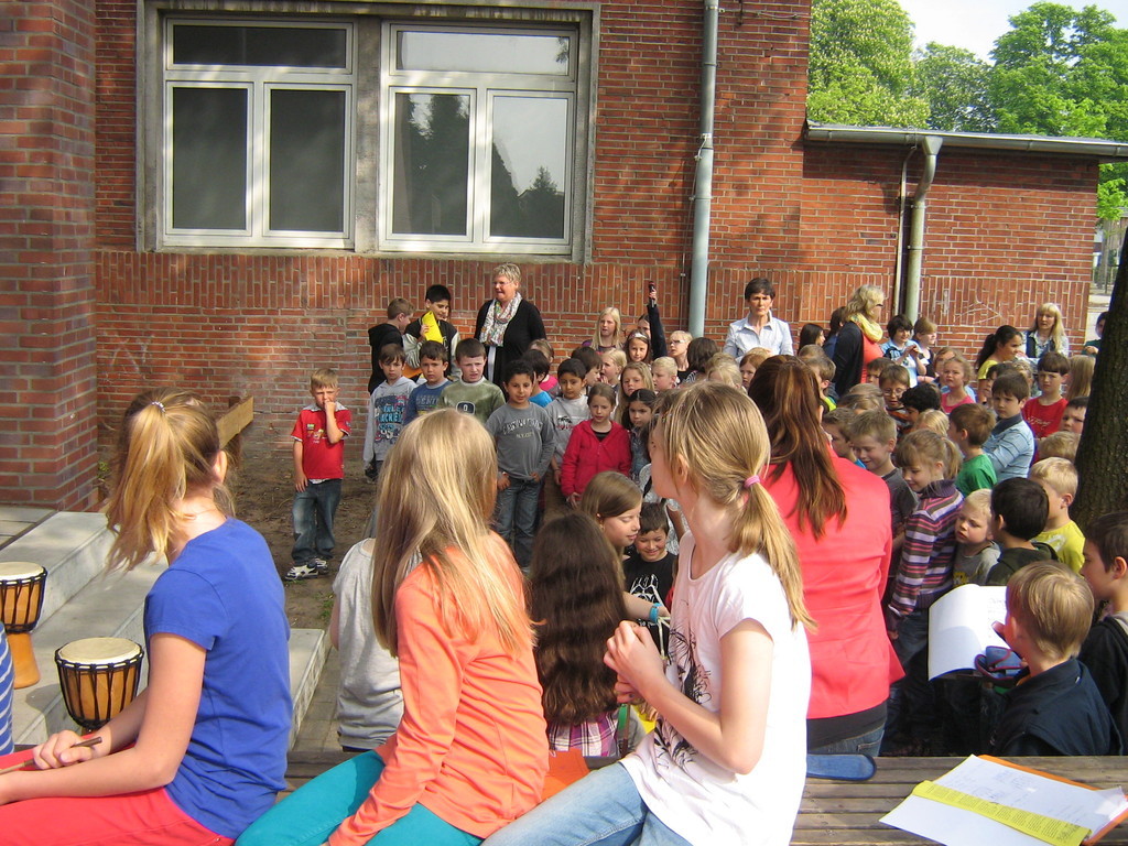Die Flötenspieler der Klassen 3 /4 und die Kinder der Klasse 4a begleiten die Lieder mit Instrumenten. Sie treffen sich um 7.40 Uhr zum Aufbauen im Musikraum/Flur.
