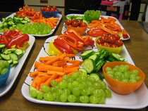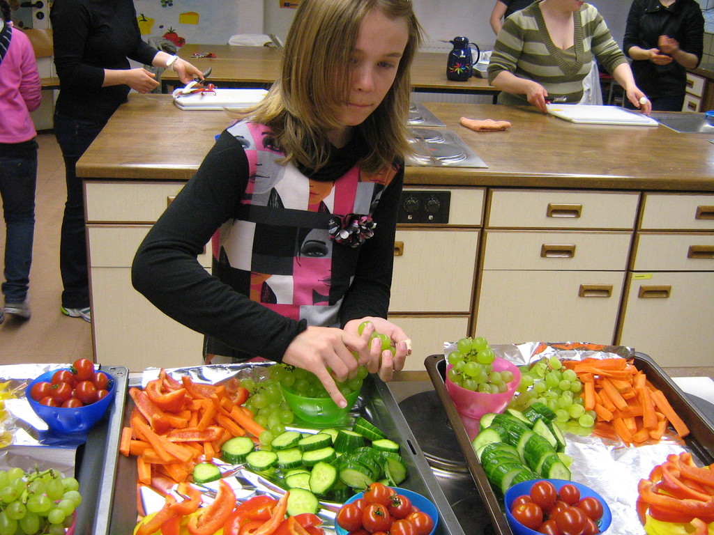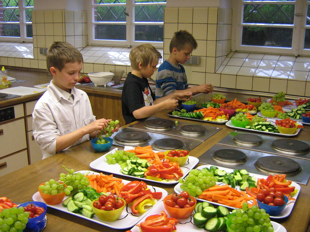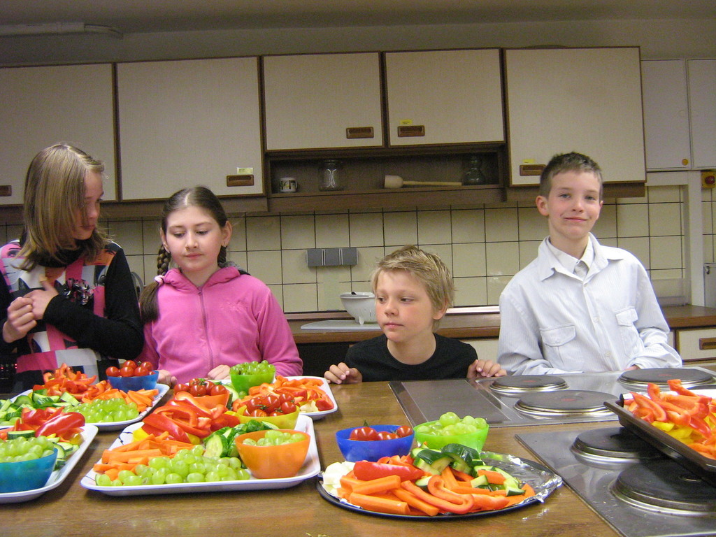 Am zweiten Mittwoch im Monat bereiten Eltern und Schüler für alle Kinder der Grundschule Blumensiedlung und der Grundschule Marienschule einen gesunden Obst- und Gemüsesnack vor.