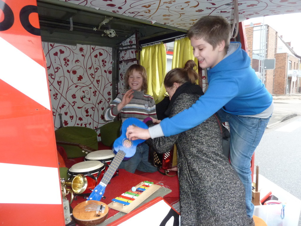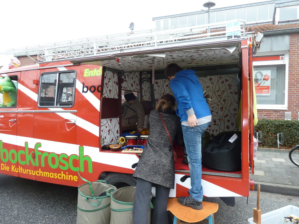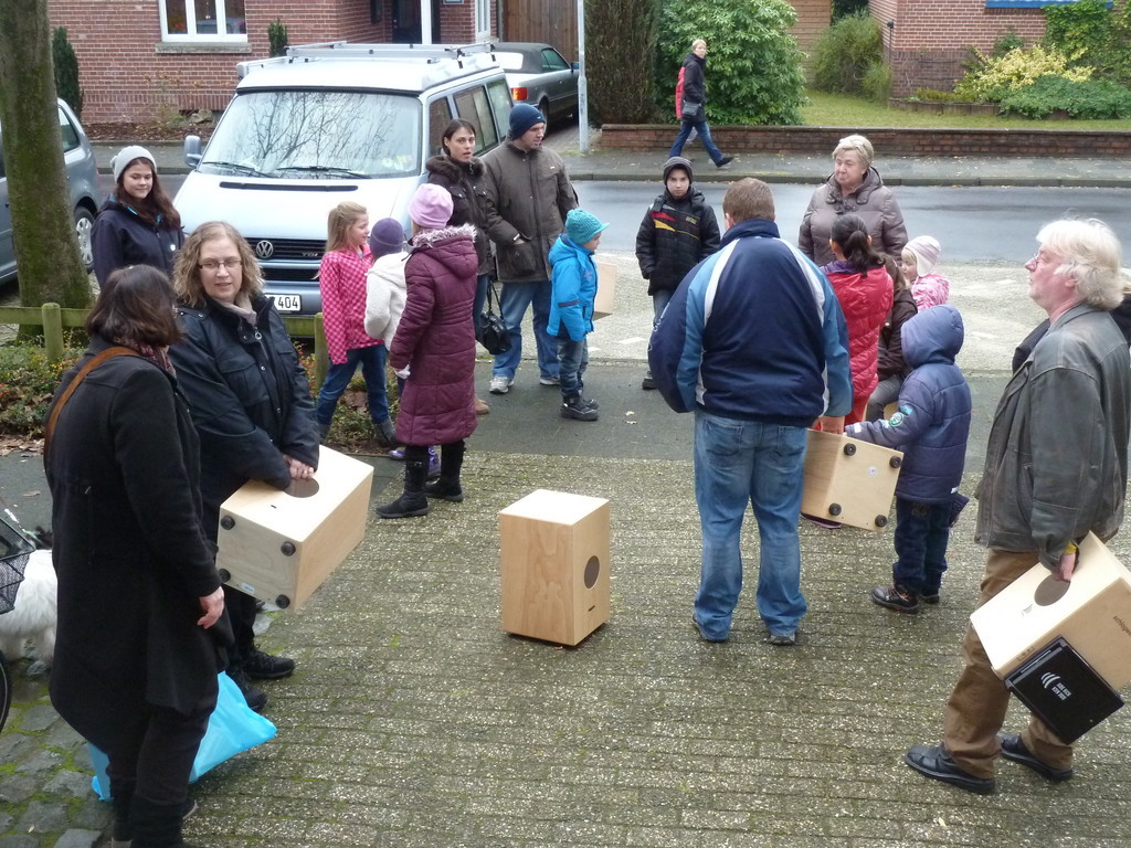 14.40 Uhr Teilnehmer des Percussionworkshops mit Wolfgang Brandt treffen sich in der Schule, um die Instrumente abzuholen.